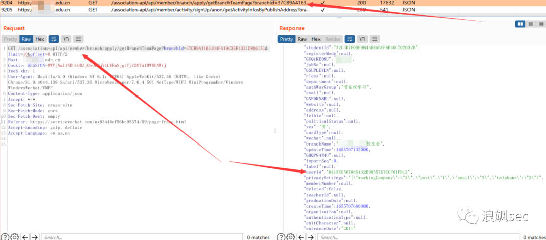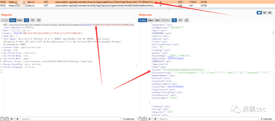 点击进入后,分析BP历史流量,可以发现在图中的请求接口中,有返回用户的userId信息,将userId填入到泄漏敏感信息的接口,可以看到能够查询到大量的用户敏感信息:姓名、手机号、家庭地址、身份证等。