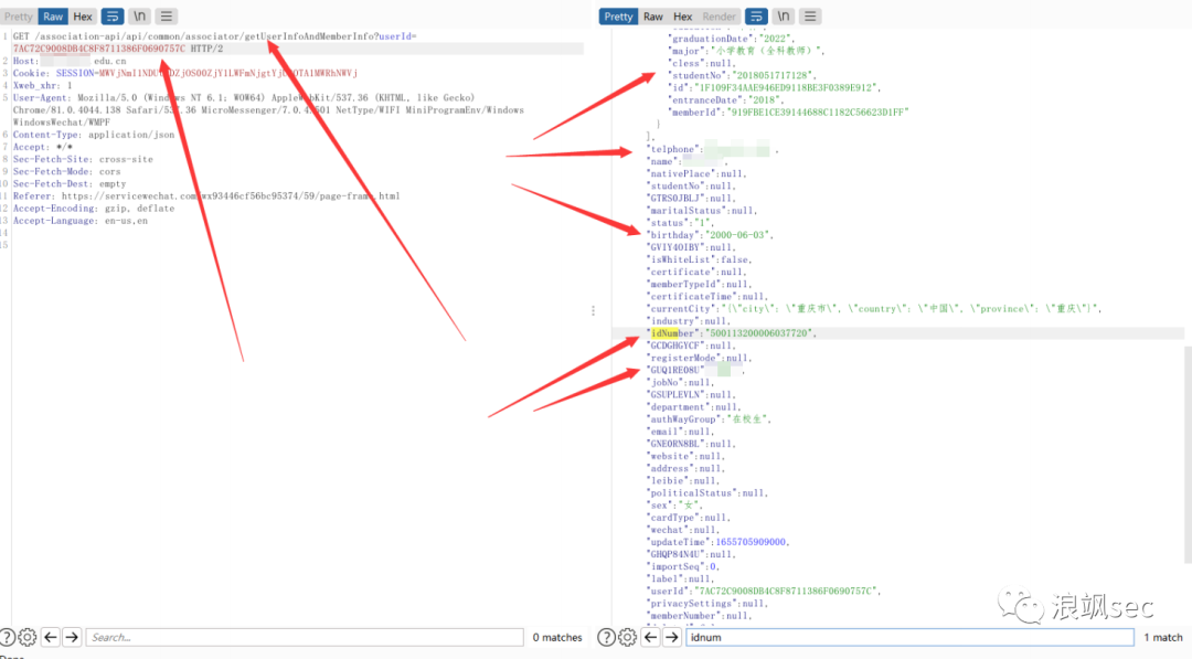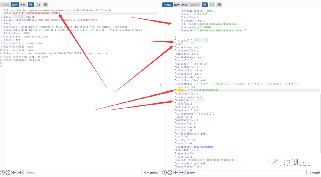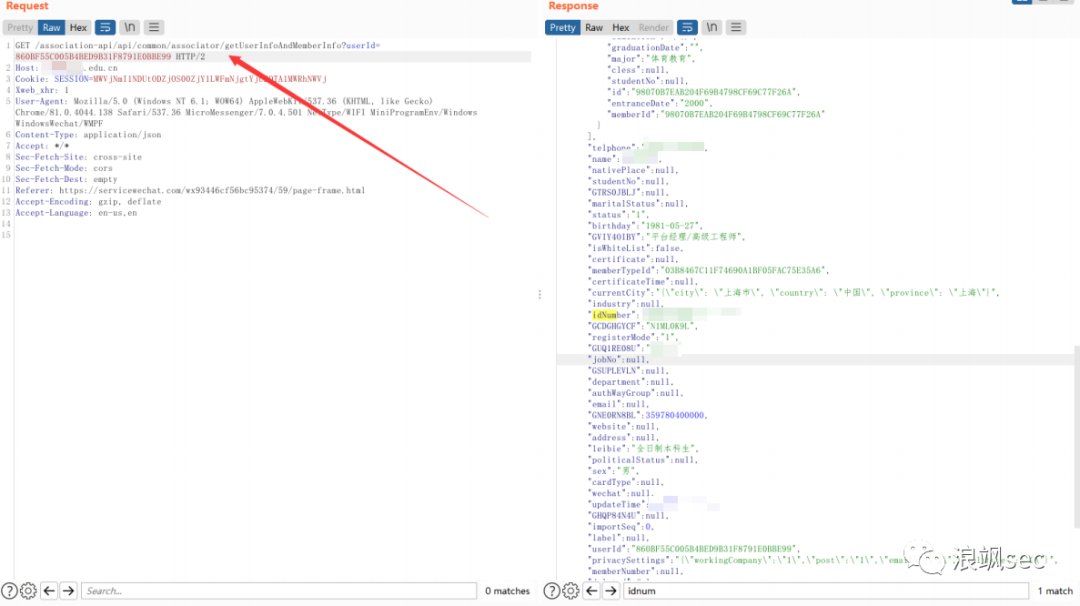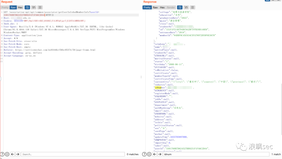 `/association-api/api/common/associator/getUserInfoAndMemberInfo?userId=342002F919874EFF9B731DF7C6C6BA93`将获取到的userid替换到刚刚发现的能够获取用户信息的请求中,可以发现该处返回了用户的敏感信息:姓名、手机号、身份证号、认证方式教职工等。