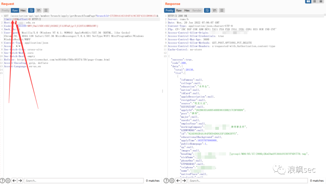 回到这个泄漏userid的接口,将该请求Ctrl+R放置重载器中,通过调节limit字段为100,可以查看响应包,能够返回100份数据,可想而知如果将其改为20000,那么至少可以将所有的的敏感信息都能获取。