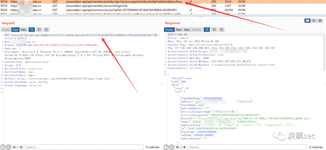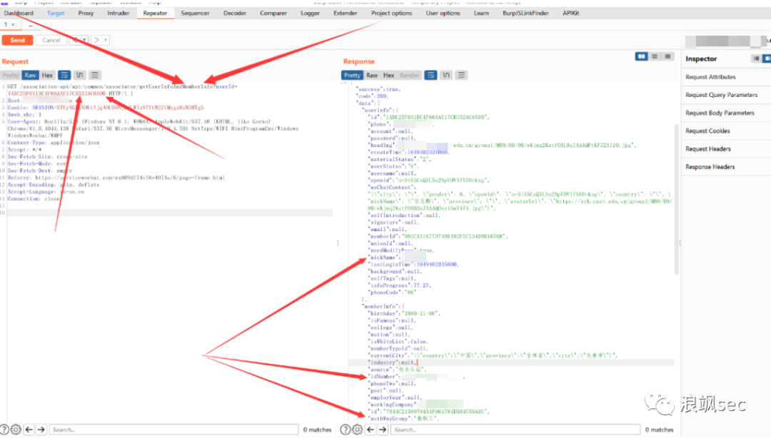 在BP的HTTP历史流量里随便找一个包Ctrl+R放入重放器中,已知之前在某小程序上发现某接口泄漏用户身份信息,将下方请求URL替换掉第三步随意抓取的请求URL