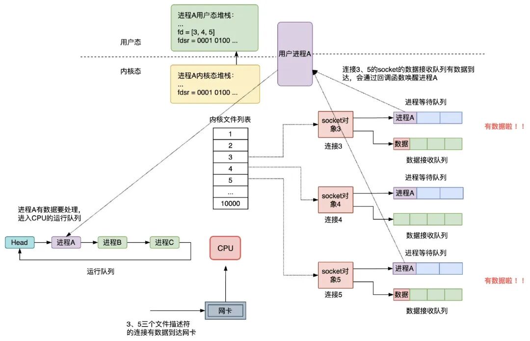 要解决“两次进程切换,单进程对单连接”的问题,服务器引入了 IO 多路复用技术,通过一个进程处理多个 TCP 连接,不仅降低了服务器处理网络请求的进程数,而且不用在每个连接的数据到达时就进行进程切换,进程可以一直运行并只处理有数据到达的连接,当然,如果要监听的所有连接都没有数据到达,进程还是会进入阻塞状态,直到某个连接有数据到达时被回调函数唤醒。