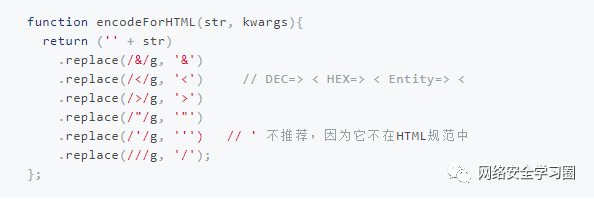 HTML 有三种编码表现方式:十进制、十六进制、命名实体。例如小于号(<)可以编码为 "十进制> <", "十六进制=> <", "命名实体=> <" 三种方式。对于单引号(')由于实体字符编码方式不在 HTML 规范中,所以此处使用了十六进制编码。