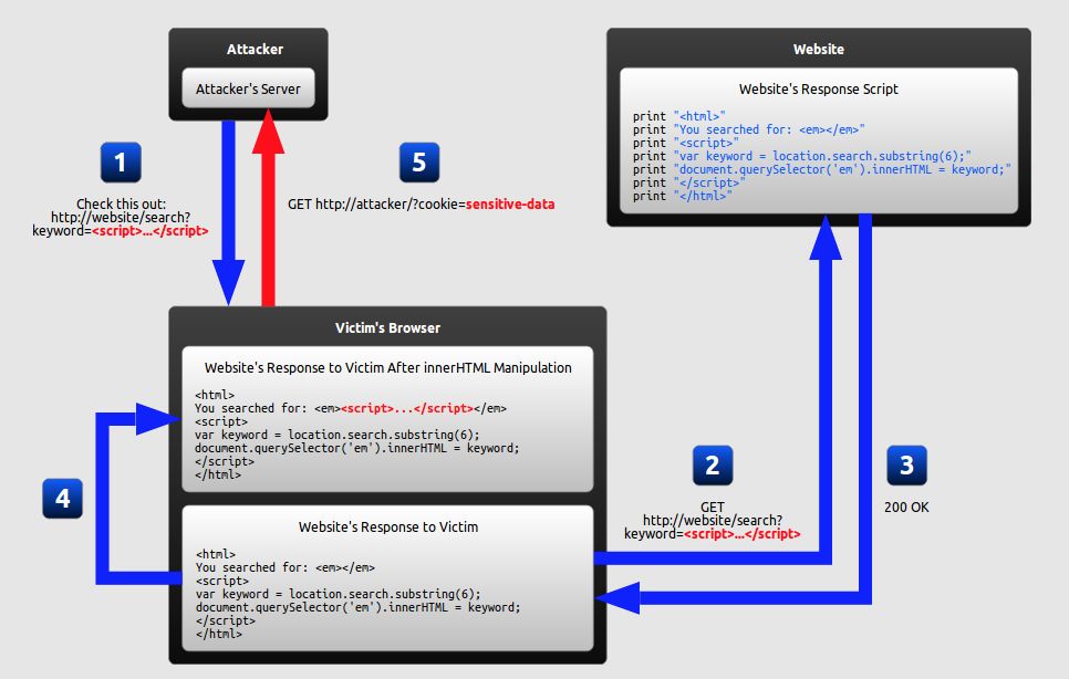 客户端的脚本程序可以动态地检查和修改页面内容,而不依赖于服务器端的数据。例如客户端如从 URL 中提取数据并在本地执行,如果用户在客户端输入的数据包含了恶意的 JavaScript 脚本,而这些脚本没有经过适当的过滤和消毒,那么应用程序就可能受到 DOM-based XSS 攻击。需要特别注意以下的用户输入源 document.URL、 location.hash、 location.search、 document.referrer 等。