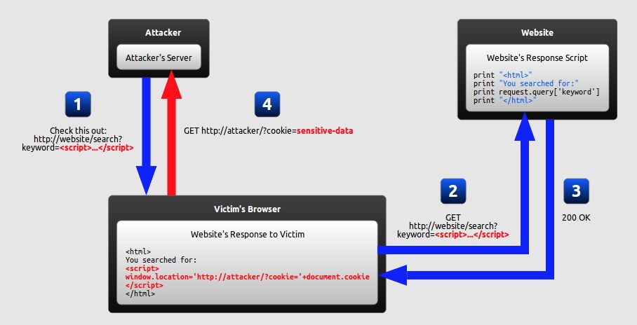 此类 XSS 通常出现在网站的搜索栏、用户登录口等地方,常用来窃取客户端 Cookies 或进行钓鱼欺骗。整个攻击过程大约如下: