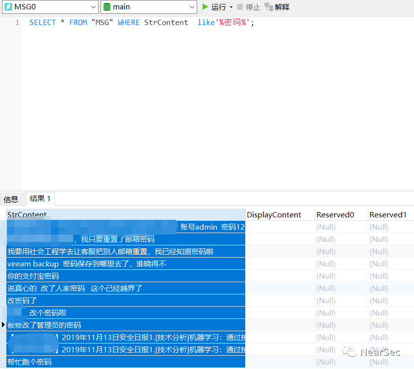 SELECT * FROM "MSG" WHERE StrContent like'%密码%'包含个人消息、群消息等等,或者直接用数据库工具的界面化查找