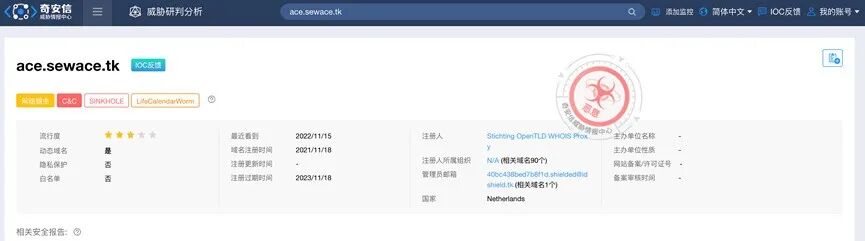 使用过程中,安全DNS(QDNS)平台产生大量告警,在学校的局域网内大概率存在失陷主机。通过奇安信ALPHA威胁分析平台研判结果显示,域名【ace.sewace.tk】被判定为恶意域名,恶意类型为网络蠕虫&挖矿病毒,恶意程度高。