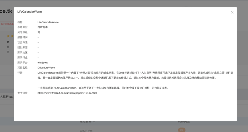 进一步查询发现,该恶意域名关联【LifeCalendarWorm】恶意家族