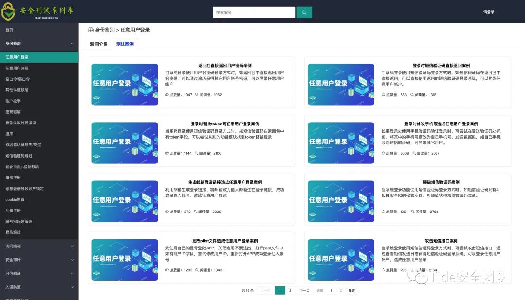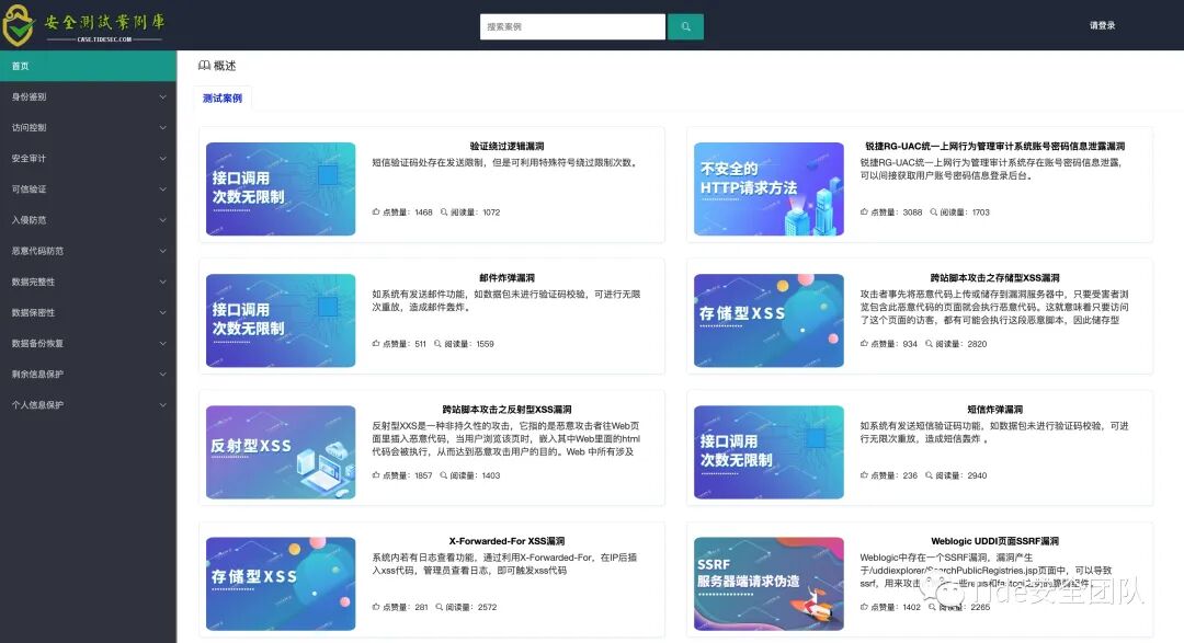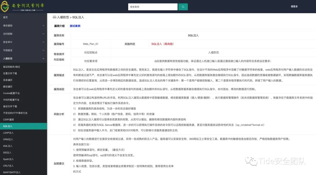 导读:信息安全测试案例库是山东新潮信息Tide安全团队结合在等级保护和渗透测试方面的经验积累,对等级保护2.0中的测评项和渗透测试项进行细致梳理,整理web安全检测和App安全检测中的160多个渗透测试项和230多个真实测试案例,为信息系统运营、使用单位和测评机构提供测试参考。