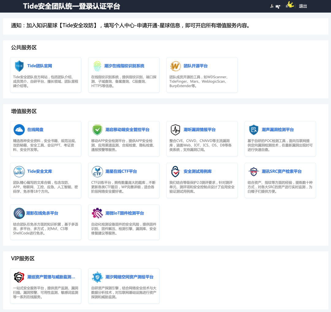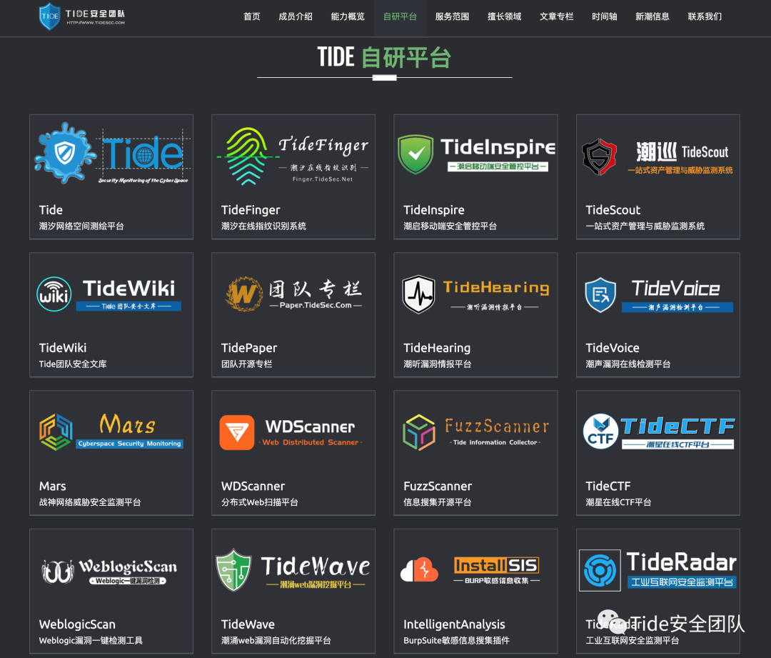 团队内部平台:潮汐在线指纹识别平台 | 潮听漏洞情报平台 | 潮巡资产管理与威胁监测平台 | 潮汐网络空间资产测绘 | 潮声漏洞检测平台 | 在线免杀平台 | CTF练习平台 | 物联网固件检测平台 | SRC资产监控平台 | ......