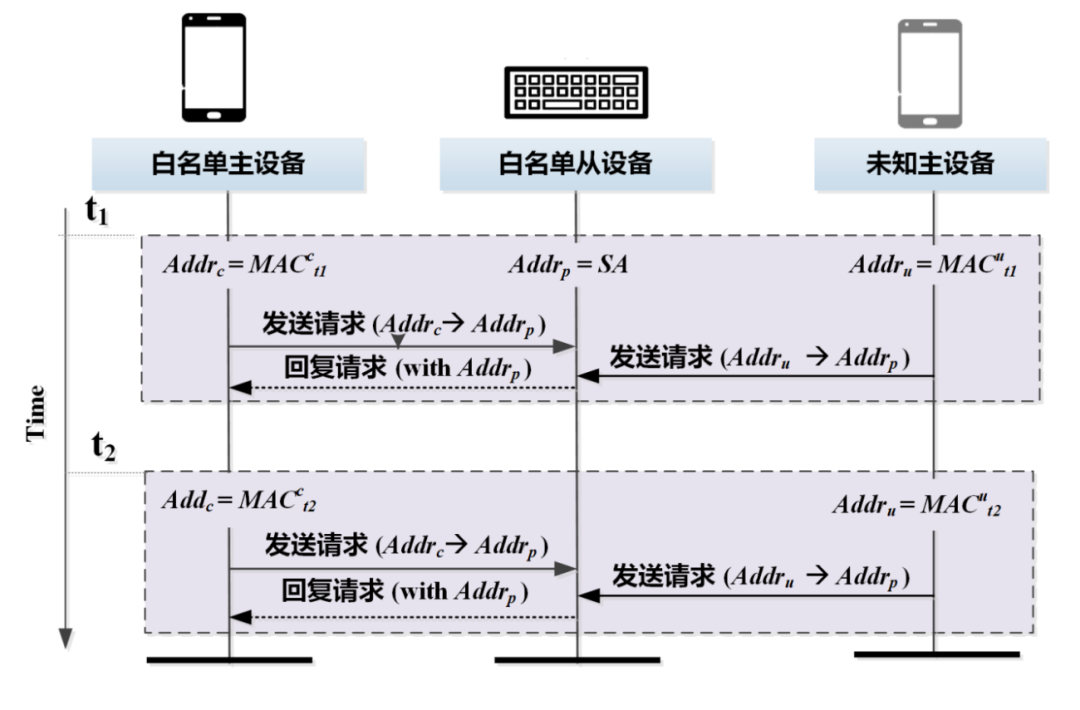 通过计算,从设备可以得到相同的哈希值,进而解决该挑战并识别主设备。第二,如果是不可信的设备,由于其没有相同的地址解析密钥,该设备无法执行上述操作恢复出有效哈希值,进而无法识别主设备。