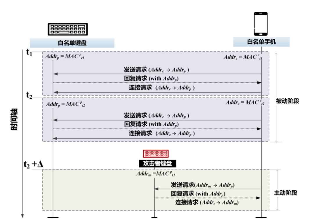 基于白名单的侧信道攻击:我们发现了蓝牙设备的白名单可以被用作一个侧信道对用户进行追踪。具体来说,当一个设备使用了蓝牙白名单,这个设备就会有选择性地只与曾经配对过的设备进行连接。如我们自己的蓝牙耳机只会被我们自己的手机控制。再如我们自己的手机在我们不需要任何操作的前提下,会自动连接我们自己家的蓝牙音箱。我们可以发现,白名单的这种特性,其实将蓝牙外设和手机建立了一种绑定关系:不管在白名单中的蓝牙设备怎么变换地址,其配对过的设备都能准确 “认出” 来。那么,攻击者只需要观察蓝牙设备之间的这种映射关系就可以确定是否具有不同地址的两个设备是否是同一个设备。如手机从地址变到地址,但是其总是连接同一用了白名单的蓝牙耳机。