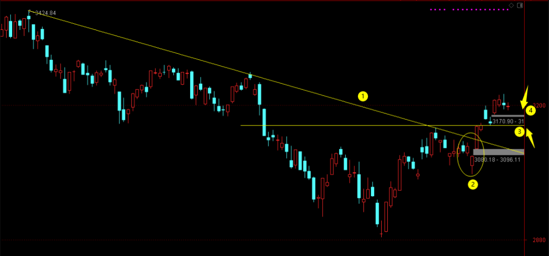 上个月说的那条下降趋势线1,在2的位置先向下补缺口后直接向上变盘,并一直涨到现在,到如今已经持续8天左右。