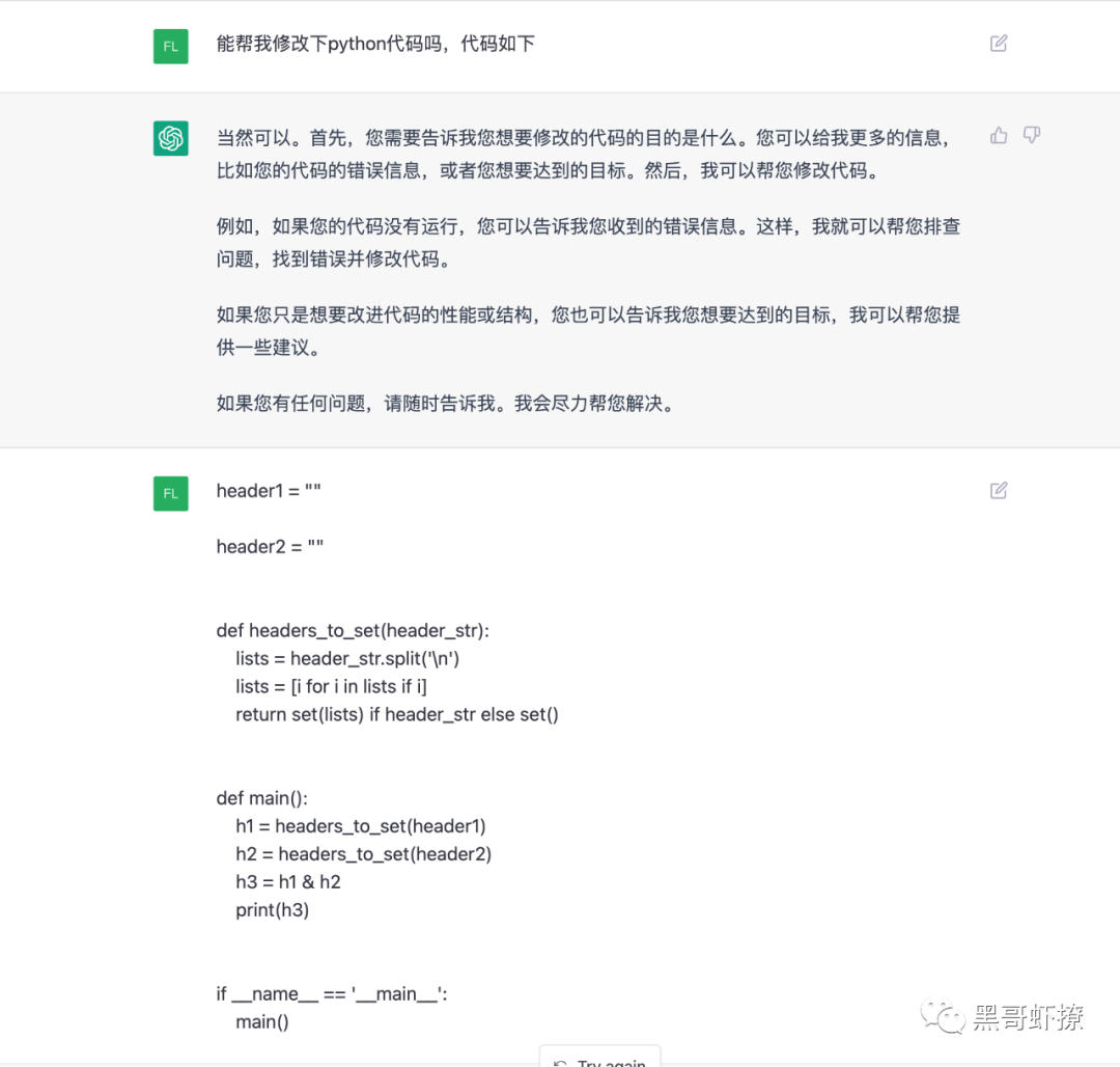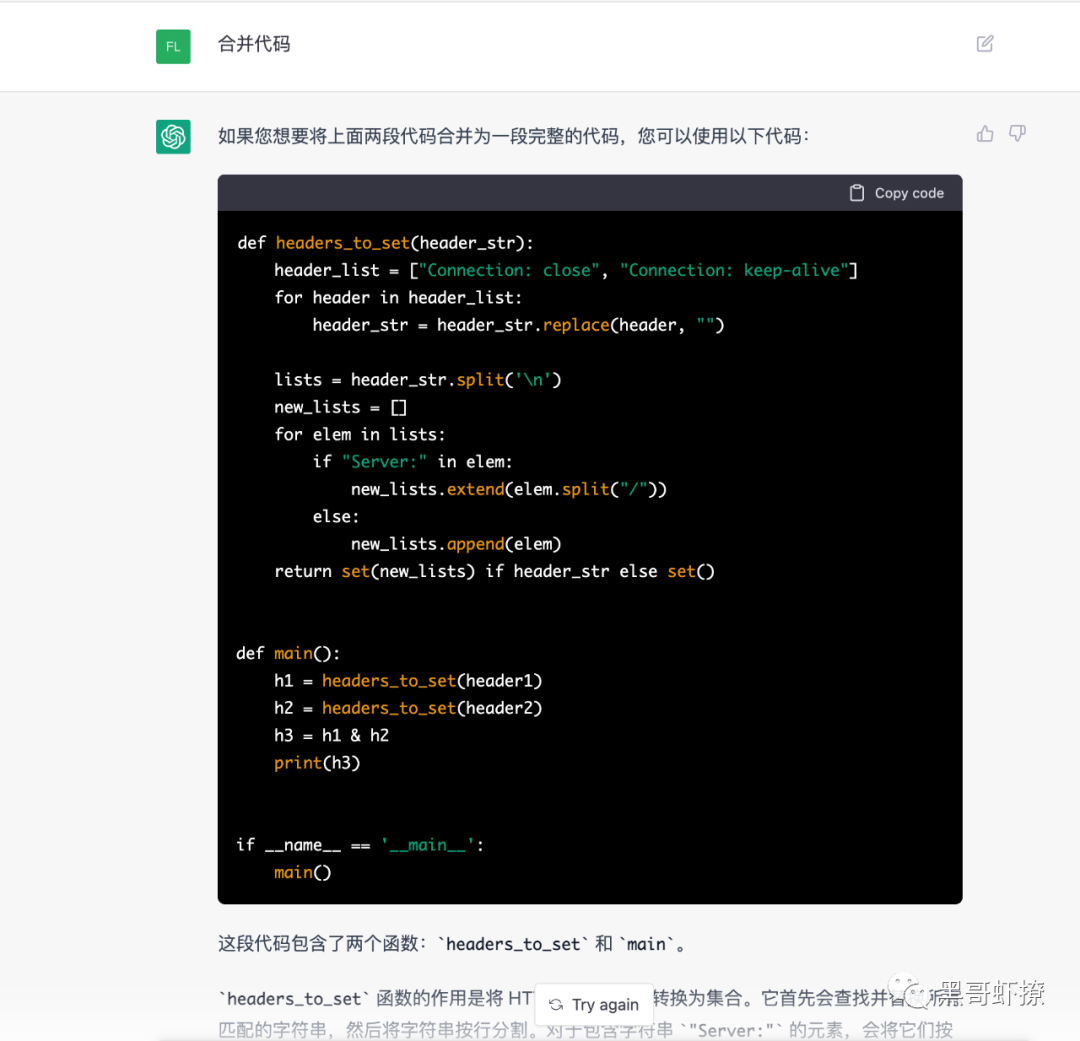 从用ChatGPT那天开始我就想着怎么让ChatGPT真正开始打工仔之路,今天有空就实战了一把,先说明下我的需求,在《谈谈网络空间“行为测绘”》的文章里我写一个脚本自动提取http返回里相同的字符串,成为自动生成ZoomEye查询关键词组合语法,所以我就给我们小伙提了个需求当然小伙很快就给代码: