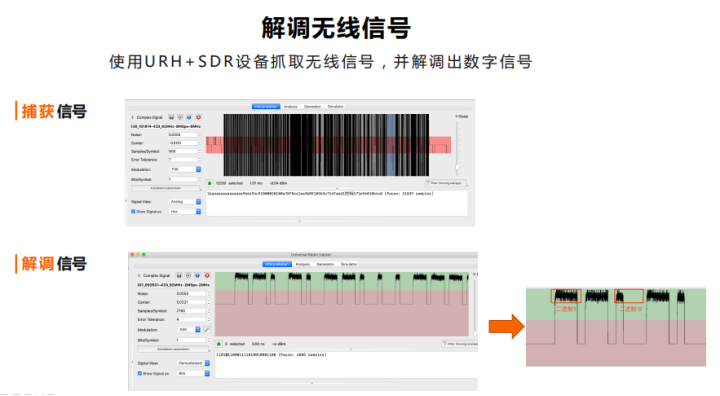 使用URH+SDR设备抓取无线信号,然对它进行解调,无线信号被解调后就会被还原成二进制数据,也可以还原成16进制等,就可以还原出通信当中它所发送的数字信息,这就是整个把无线信号转换成数字信号的过程。