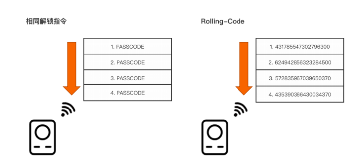 传统的解锁指令,无论按多少次解锁指令,Pass code都是相同的,攻击者只用捕获其中一次通信就可解锁车辆。目前主流车厂都配有滚码技术,每次的Pass code是随机的,攻击者无法预测下一次应该发送什么解锁指令,车辆会认为是非法钥匙,就不会去开门,这样就达到了防御重放攻击的目的。