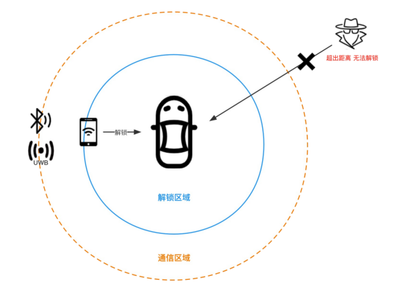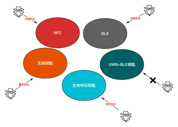 UWB技术可以终止中继攻击。原因是 UWB 芯片总是测量车钥匙和汽车之间的直线距离(测量光速 TOF),如果车钥匙不在车内,汽车的引擎就无法启动,非常有效地进行防御中继攻击。