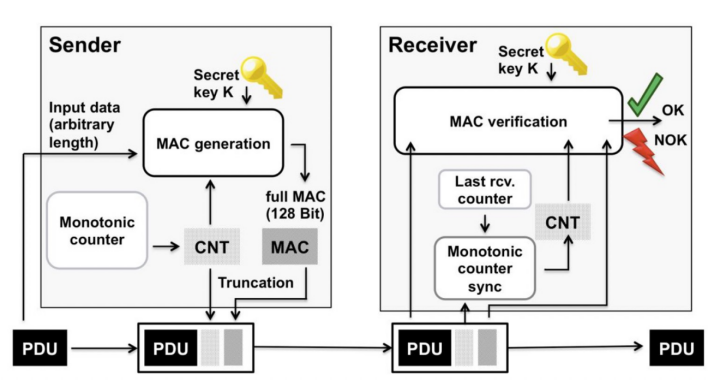 The Autosar concept Secure Onboard Communication(SecOC) 检查单个传输协议数据单元的真实性,以检测攻击,例如重放、欺骗和篡改。