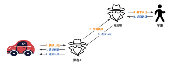 比如,车主正在办公室工作,车辆放在相距几百米的地库。此时两名攻击者黑客A和黑客B,其中黑客A就站在车辆旁边,黑客B在车主附近。黑客A拿出模拟设备,对车辆发出解锁请求,黑客A拿到了要求认证的信息,通过4G、5G技术传输给黑客B。黑客B也有一个模拟出来的蓝牙设备,他把要求认证的信息在靠近车主之后发送给车主真正的蓝牙钥匙,真正的蓝牙钥匙误以为是车辆发过来的认证要求就会进行处理,并返回一个合法的认证信息。