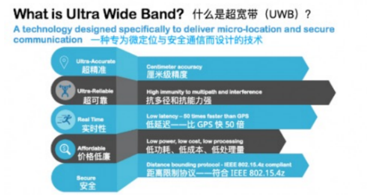 基于IEEE802.15.4a/f/z标准的「超宽频」(Ultra-Wideband;UWB)技术是一种利用纳秒级窄脉冲进行资料传输的无线通讯技术。其优势如下图所示