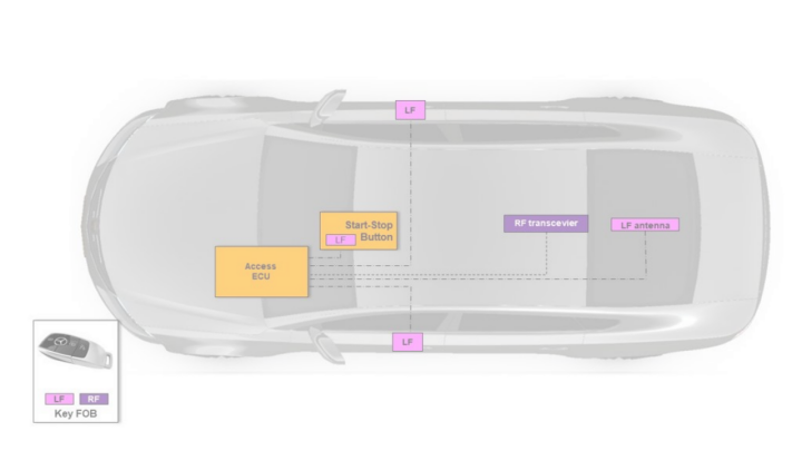 车钥匙有高频和低频两个信号发射器,按下解锁按钮时,车钥匙通过高频信号来远程解锁车辆,当车主拿着车钥匙进入到车辆内部以后,通过低频信号进行通讯,通过低频的方式判断车钥匙是否在车内,并判断是否是合法的车钥匙。