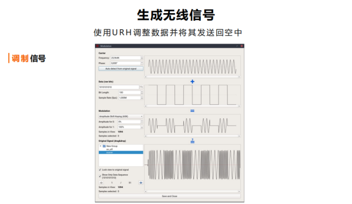 如果需要对还原出来的信号进行篡改,需要先把模拟信号给转换成数字信号,再对数据信号进行调整把它还原成无线信号发送出去。此时候就用到了调制技术,把二进制数据跟特定的载波,用特定的调制模式变成无线信号,最终再通过HackRF硬件设备把它发送出去,这样就可以在接收车钥匙信号后,对它进行篡改,再发送给车端。