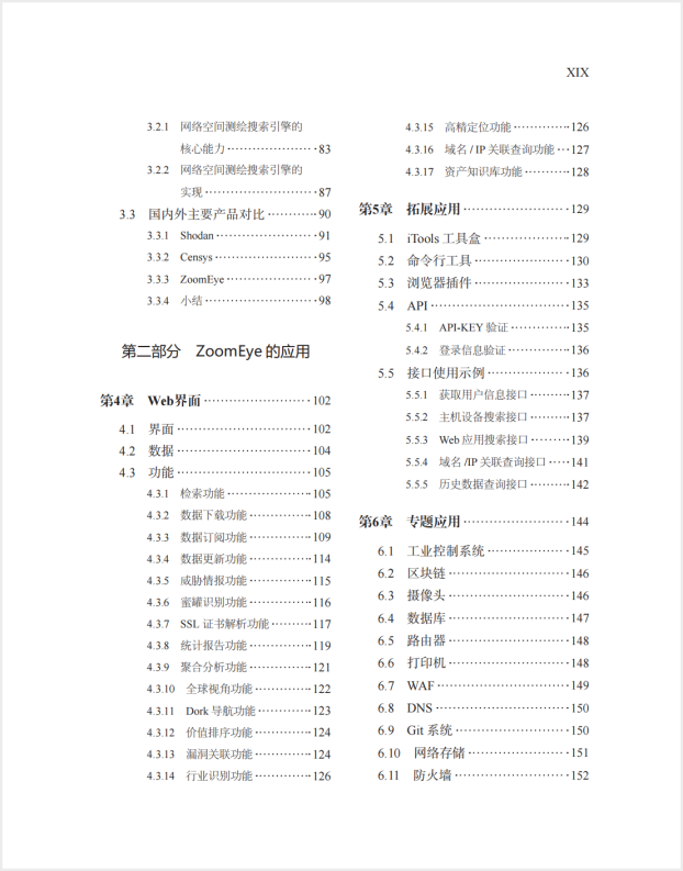 第四部分附录则是对前面内容的进一步完善,对网络空间测绘搜索引擎中常用的术语、过滤器、搜索语法、数据属性等进行介绍和说明。