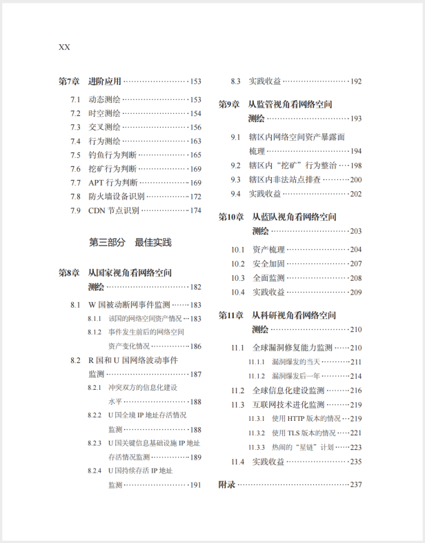 第三部分从 4 个视角详细介绍如何利用网空测绘引擎快速实现全球范围内网络空间资产评估、网络空间资产风险暴露面排查、网络基础设施威胁监测、安全态势感知和网络安全研究等。