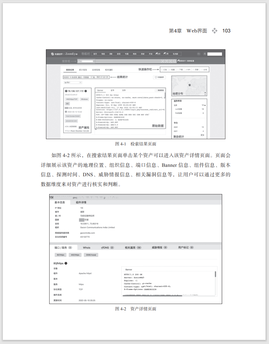 第二部分以全球众多安全研究员使用的网络空间测绘搜索引擎ZoomEye(钟馗之眼)为例,通过详细的操作步骤和演示图片,对包括 Web 界面、拓展应用、专题应用和进阶应用进行详细讲解。读者通过阅读,能对此类工具及其使用有更加深刻的了解。