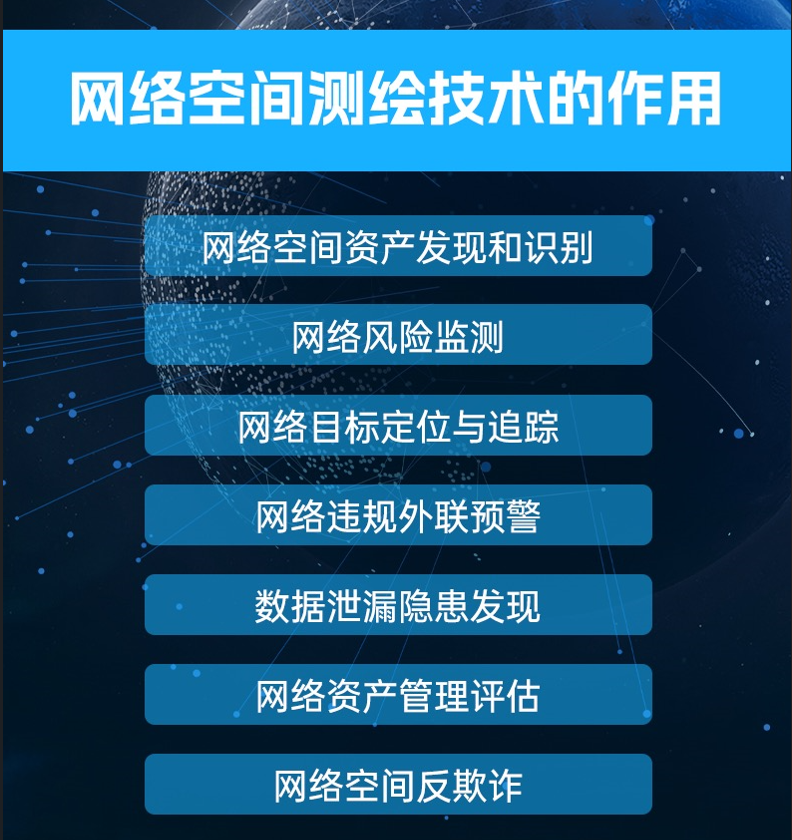 网络空间已成为继“陆、 海、空、天”后的第五大空间,网络空间亦需要类似地理空间地图、可全面描述和展示网络空间属性和信息的“网络地图”。而网空测绘就好比更具广度的Google,让人们可以方便地搜索到网络空间上的设备,从而在网络攻防战中掌握主动权。