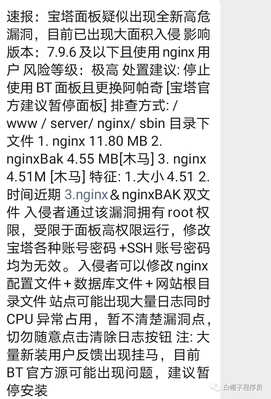 根因:非网站程序漏洞,nginx程序被篡改。同时宝塔后台日志被清空。