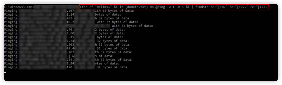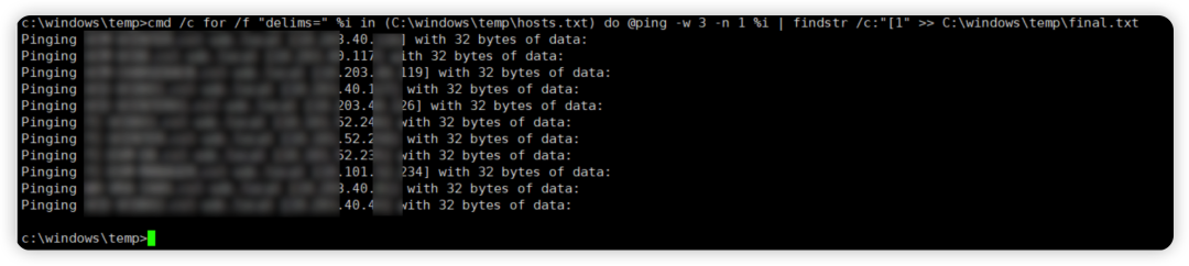 c:\windows\temp>cmd /c for /f "delims=" %i in (C:\windows\temp\hosts.txt) do @ping -w 3 -n 1 %i | findstr /c:"[1" >> C:\windows\temp\final.txt