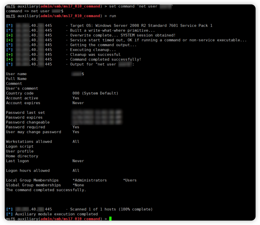 并且发现两台 DC,其中 40 的 DC 叫 AAA 域,30 的 DC 叫做 BBB 域,发现 AAA 域存在 17010,system 权限,可以执行命令,随后添加了一个隐藏用户并且添加到了管理员组: