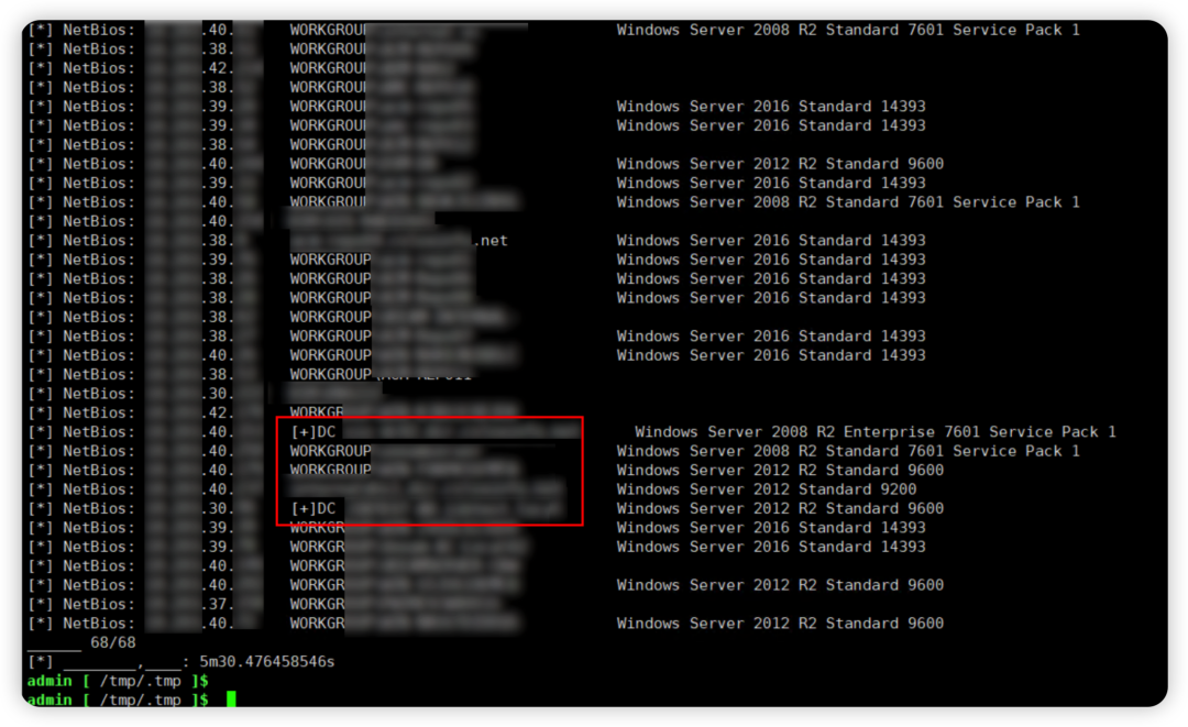 对当前内网进行信息搜集,我一般习惯用 NetBios 或者 LDAP 去探测内网域,当然实际情况需要用到不同的手段,因为当前的 admin 权限没有 Ping 命令,在这里姑且用 NetBios 去对内网进行初步扫描,扫描后发现当前 xxx.xxx.42.xxx/16 段发现是有域的: