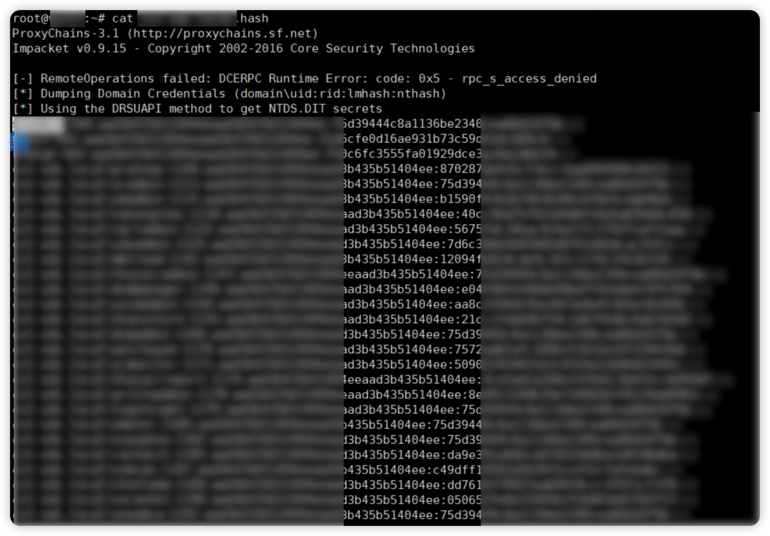 无妨,我们通过 Metasploit 弹了一个正向 shell 后拿到域管理的 hash,随后远程导出域内用户 hash: