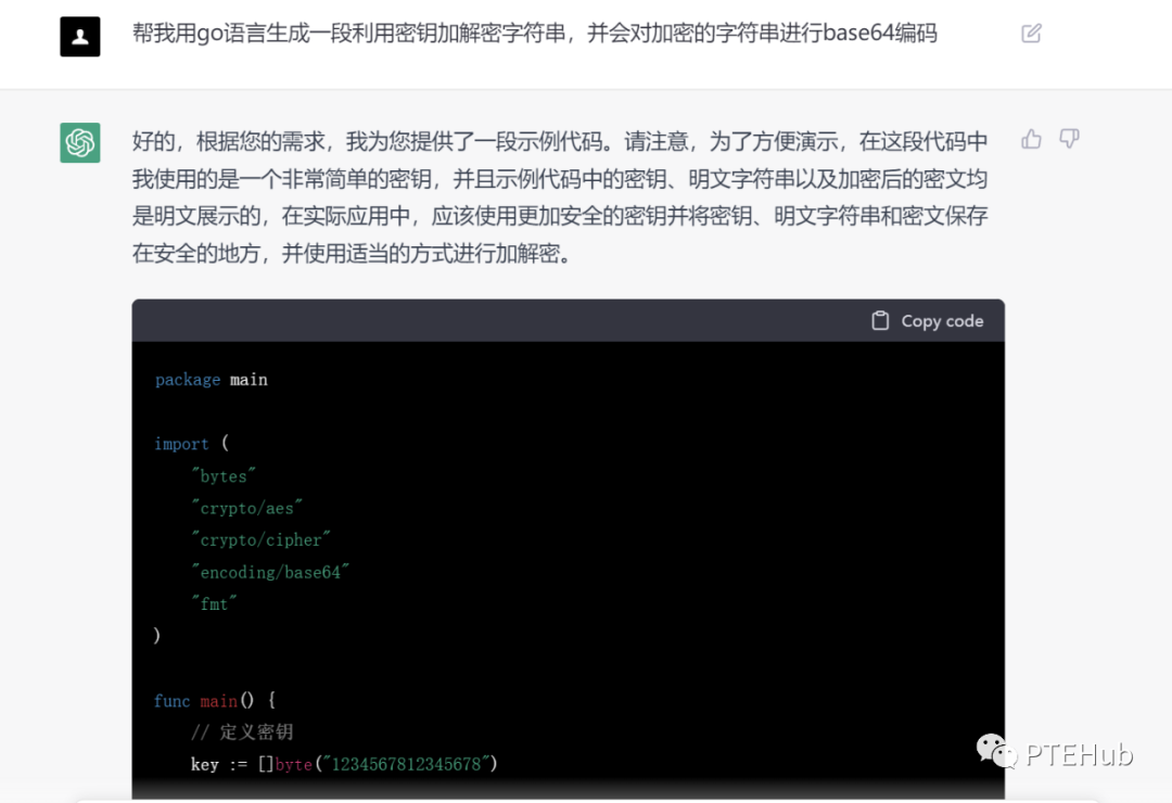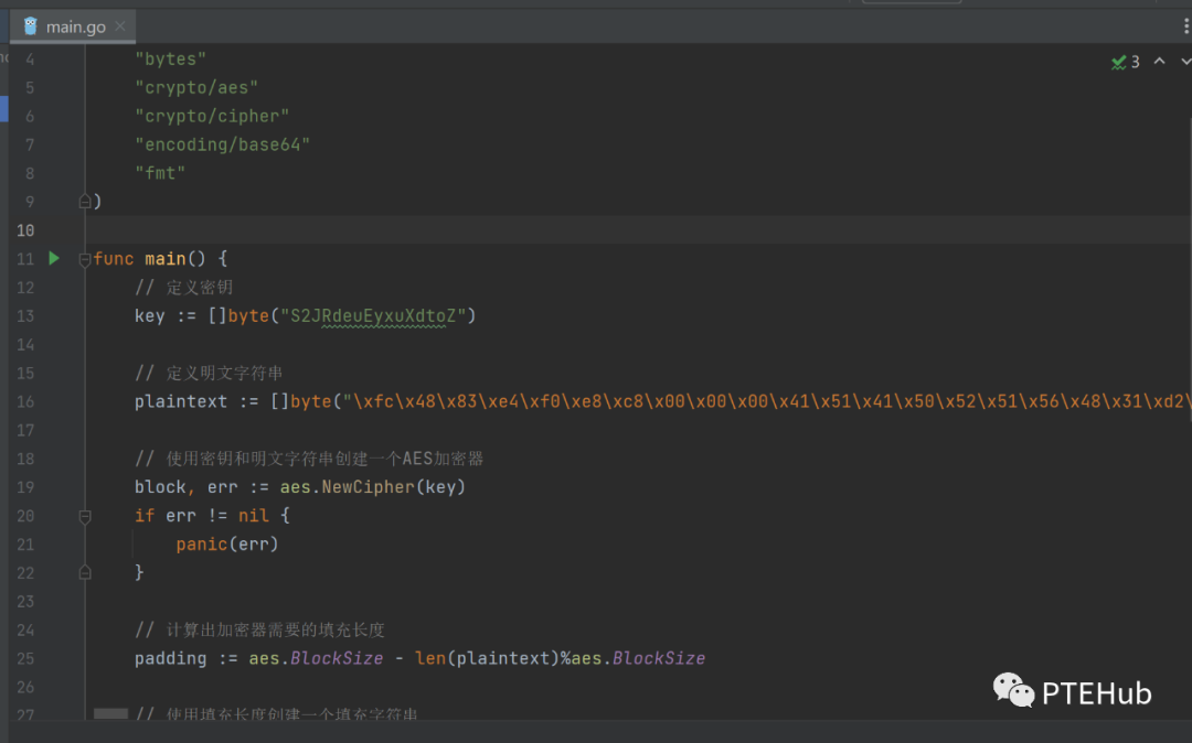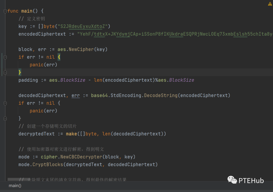 package mainimport ("bytes""crypto/aes""crypto/cipher""encoding/base64""fmt")func main() {// 定义密钥key := []byte("密钥")// 定义明文字符串plaintext := []byte("shellcode")// 使用密钥和明文字符串创建一个AES加密器block, err := aes.NewCipher(key)if err != nil {panic(err)}// 计算出加密器需要的填充长度padding := aes.BlockSize - len(plaintext)%aes.BlockSize// 使用填充长度创建一个填充字符串paddingText := bytes.Repeat([]byte{byte(padding)}, padding)// 将填充字符串添加到明文字符串末尾,得到需要加密的字符串encryptedText := append(plaintext, paddingText...)// 创建一个存储密文的切片ciphertext := make([]byte, len(encryptedText))// 使用加密器对需要加密的字符串进行加密,得到密文mode := cipher.NewCBCEncrypter(block, key)mode.CryptBlocks(ciphertext, encryptedText)// 将密文进行base64编码,得到最终的加密结果encodedCiphertext := base64.StdEncoding.EncodeToString(ciphertext)fmt.Println(encodedCiphertext)}
