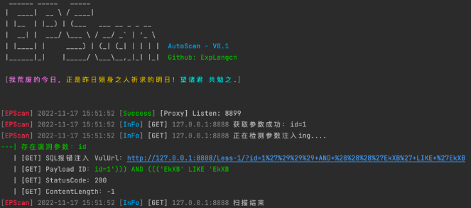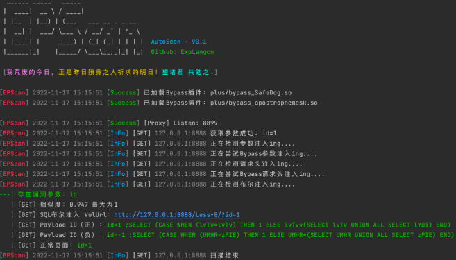 ./EPScan -hUsage of /EPScan:-deep bool // 选择后开启,默认不开启,不开效率快但是误报微高深入扫描(降低效率提高准确率)-pdelay string // 需带有http协议头,看例子流量转发(程序的流量转发到指定端口,例如Burp的8080端口: http://127.0.0.1:8080)-pdir string // 加载指定目录下所有的插件,默认不进行Bypass批量加载指定目录下的Bypass插件-plist string // 查看插件信息,默认输出 "plus/" 目录下的插件信息查看插件列表和详细信息 (default "plus/")-port string // 开启监听端口监听端口配置 (default "8899")-ptest string // 测试指定插件效果 会输出原始Payload和处理后的Payload插件测试-run bool // 开始被动式扫描,例如:./EPScan -pdir plus/ -port 8899 -run开始被动式扫描