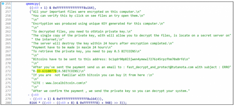 CryWiper 执行后,首先会创建计划任务实现维持,再使用受害者机器的名称与命令和控制服务器进行联系,获取下一步命令,确定 wiper 是激活还是保持休眠状态。激活命令运行后,CryWiper 将停止与数据库交互的关键进程,销毁数据,并删除受感染机器上的卷影副本,防止恢复已删除的文件。此外,CryWiper 还通过修改 Windows 注册表以阻止 RDP 连接,阻碍远程 IT 专家的事件响应。最后,擦除器将破坏除“.exe”、“.dll”、“lnk”、“.sys”、“.msi”和它自己的“.CRY”之外的所有枚举文件,同时还会跳过系统、Windows 引导目录,以防止使计算机完全无法使用。最后生成名为“README.txt”的赎金票据,要求 0.5 比特币(约 8,000 美元)以换取解密器。据研究人员称,勒索只是一个幌子,主要目的是销毁数据。