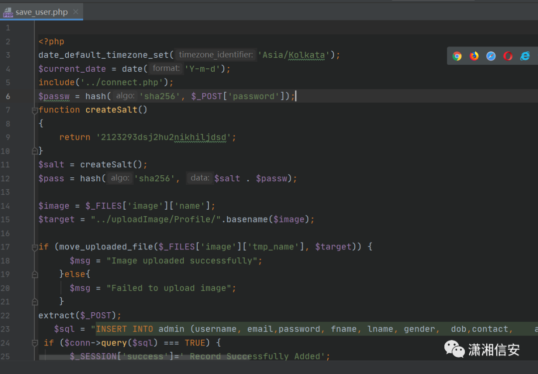 最近又到了学生考试的时候,在一高校下发现了一考试管理系统如下:很遗憾,是没有的,也很正常,那接下来我们去搜集一下信息吧,先去扫一下这个域名。扫出来很多,但打开都会跳转到登录页面,加了权限验证,陷入思考。。。本人在大学担任过学校网络管理员,大学的项目基本都是外包给公司的,这里应该是开发公司的群,我们加一下,加成功发现似乎是售后的我们与客服聊了一下,伪装成客户,并不是很成功,也没有得到什么有效的信息,客服回复信息也是非常的慢,我们继续去群里吧这很好,似乎看到了点希望,有两个压缩包和一些没用的(其实是我看不懂,哈哈),那个1.zip里面又是一堆没用的文档,但那个pages.rar里却是一些php文件,我去问了下客服这是什么,她说是这个版本如果出问题就用这个替换一下。打开之后,一个个去观察,尤其是最后的几个save开头的文件密码是用sha256+salt的方式加密的,继续往下看发现了数据库执行操作,现在我们已经大致知道了这个页面的作用,它是保存用户信息用的name=image,标准的图片上传,我们自己去写上传包写成这样,也不知道对不对,先试试,不行再改