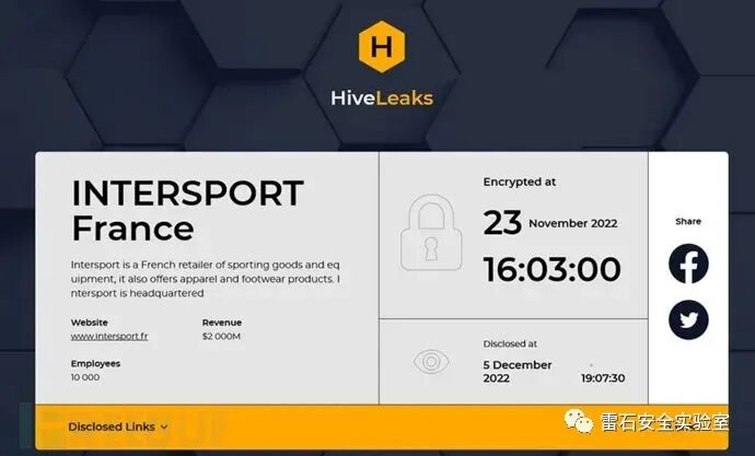 近日,Hive勒索软组织对外公布了在11月份对法国体育零售商Intersport的攻击中获得的客户数据。