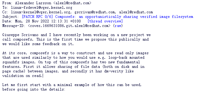 红帽工程师 Alexander Larsso 与 Giuseppe Scrivano宣布开发一个新的 Linux 内核文件系统 “Composefs” ,Composefs 是一个新的机会共享(opportunistically-sharing)和可验证的只读文件系统。简单来说,composefs 是一种构建和使用只读映像(read only images)的方法,这些映像的使用方式类似使用回环的 squashfs 映像。但除此之外,composefs 还有两个新的特性:它允许在映像之间共享文件数据(磁盘上和页面缓存中),其次它具有类似 dm-verity 的读取验证。