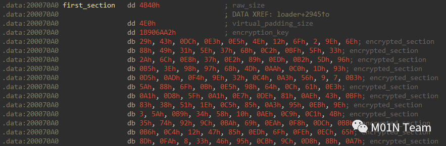 图中显示的自定义结构,raw_size 对应 SizeOfRawData, raw_size + virtual_padding_size 对应 VirtualSize。缺少VirtualAddress和PointerToRawData等效,因为Roshtyak将按顺序加载这些节区
