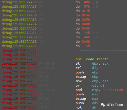 共享段中的shellcode代码,很难找出起始地址,因为其通常是位操作指令bt