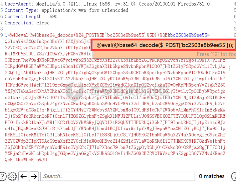 但是看到了使用base64编码之后是有eval字样的,这样的话,肯定被态势感知和全流量一体机来进行特征的抓取,肯定会报威胁。