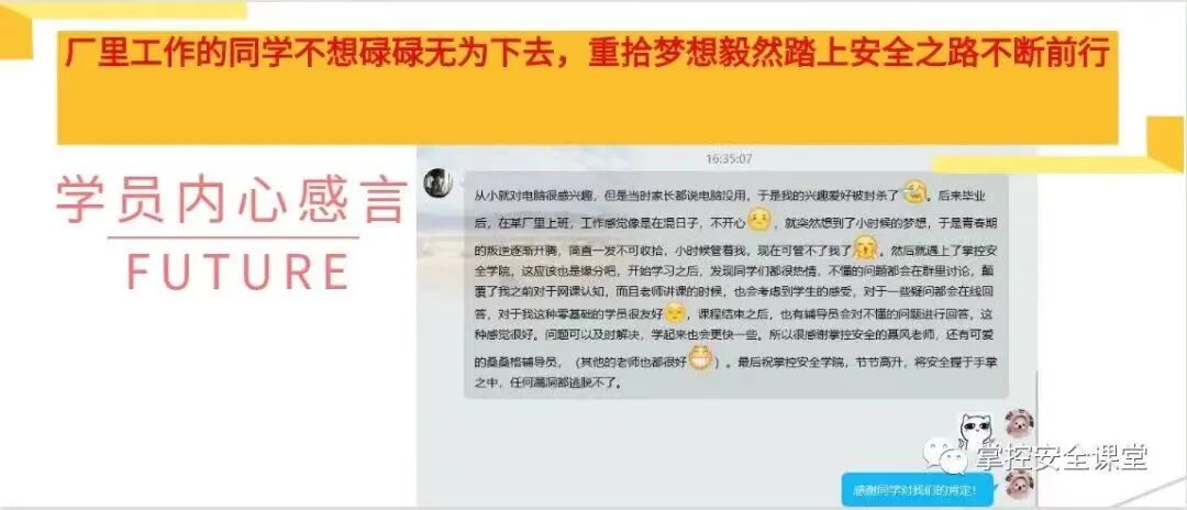 全套课程+实战靶场练习+课程录播回放+辅导员在线解疑,直播时可以一起聊聊,大家工作中遇到的问题和职业发展方向、瓶颈等,很乐意为大家解答!
