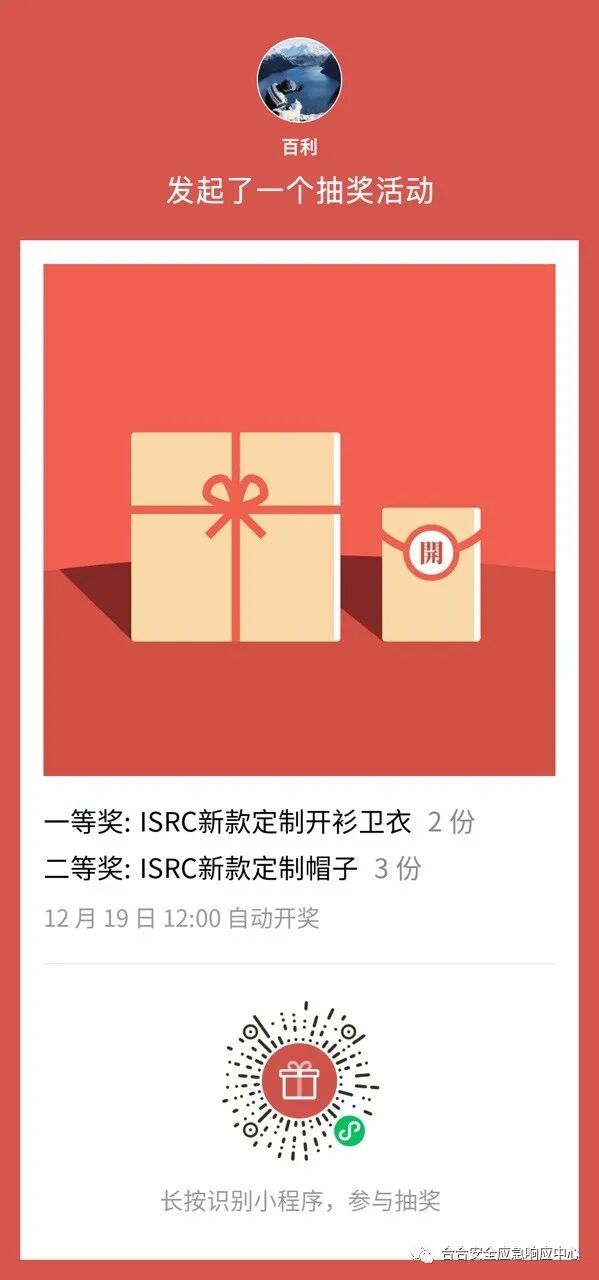 给ISRC年度TOP5白帽送上我们的年终奖励,快来一起看下今年的丰厚礼品,其中包含ISRC定制新款开衫卫衣!!